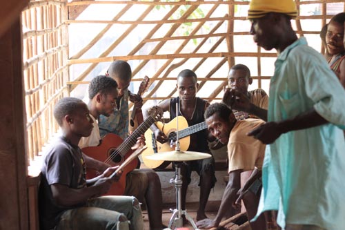 Feb 22nd 2014 I had spent a couple of days in the Forest camp at Djamba where I were recording some childrens songs. These had been commissioned by Opportunity Africa for a Baka education project (see a video HERE). Jonny and Clyde filmed the recording session and this morning we made the 9km walk through the forest back to Gbiné to start rehearsals for the tour. Martin We were nearing our first "official" concert of the tour and had spent the last week or so preparing: band practices, battery charging, building kick drums out of water bottles, projector screens from sheets and for me personally, on my first trip to Cameroon - having an incredible intensive into Baka life and culture. The first concert was to be tomorrow in the Music House, built by Andi with the help of the Baka - and today the band got together for a final rehearsal. . . . Jonny