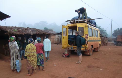 March 13th 2014 We'd made it all the way from Gbiné on two different Alliance buses - staying on the side of the road one night and at a hostel in Bertoua the second night. We were all tired from the bumpy road but after a brief stop in Abong Mbang we were warmly welcomed by the people of Lakabo. However, this was only after having to unload whole the contents of the roof rack into the bus, allowing us to pass under a fallen tree. A few speeches were made in accordance with the Sous Prefet approved programme and then we were treated to some wonderful music from the Baka of Lakabo. Orchéstre Baka Gbiné took to the stage, playing into the night before setting up the projector and playing some films. It was a great concert and everyone was in high spirits on the way back which meant that we all sang for almost the whole journey back to Abong Mbang, where we slept the night under the stars. Jonny